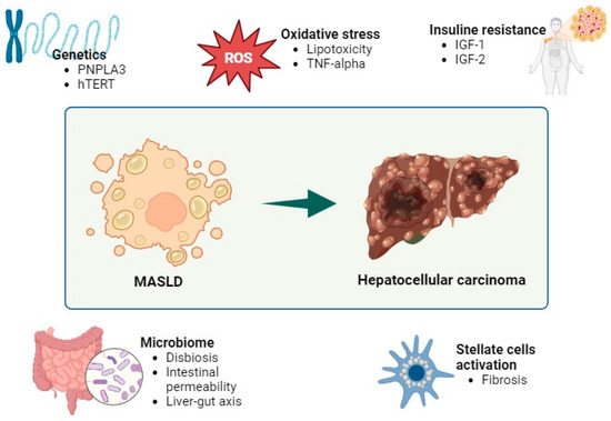 As of now, the precise etiopathogenic pathways linking hepatocellular carcinoma (HCC) to MASLD remain elusive. Insulin resistance stands out as a pivotal factor in carcinogenesis. Insulin resistance and subsequent hyperinsulinemia contribute to elevated levels of insulin-like growth factor 1 (IGF-1), which, in turns, promotes cell survival, stimulates cell proliferation, and facilitates angiogenesis. Additionally, albeit to a lesser degree, IGF-2, which shares similar biological effects with IGF-1, is also elevated [21].