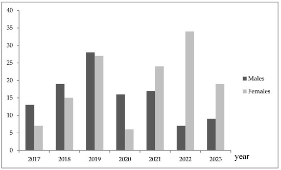 The adolescents in our sample (n = 153) were more frequently hospitalized in the pre-pandemic (n = 131, 54.4%) than in the pandemic/post-pandemic (n = 110, 45.6%). As shown in Figure 1, the frequency of adolescent hospitalizations was statistically significantly different in males and females in the whole study period (Pearson Chi2 = 27.01, p = 0.000). In the pre-pandemic period, males were more frequently hospitalized, whereas female adolescents were more often hospitalized in the pandemic/post-pandemic compared to the previous period (Pearson Chi2 = 8.54; p = 0.003) (Table 1, Figure 1). In particular, male hospitalizations were prevalent in 2017 (SR = 2.35, p < 0.05) and 2020 (SR = 2.88, p < 0.05), and female hospitalization was prevalent in 2022 (SR = 3.95, p < 0.05).