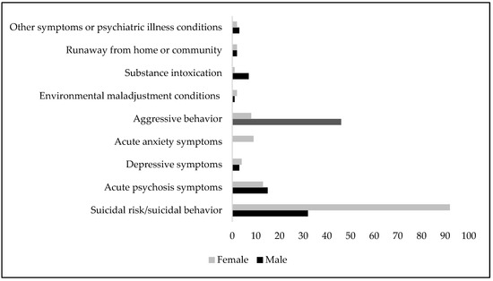 In our sample, the most frequent reasons for psychiatric hospitalizations in females was represented by suicidal behavior, whereas in males, aggressive behavior was prevalent, suggesting two different reactions to stressful environmental conditions between males and females. Similarly, the shift in hospitalizations from males to females during the pandemic can be interpreted as different vulnerabilities to environmental stressors.