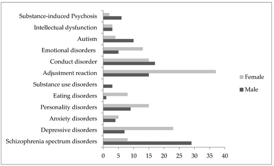 Among the discharge diagnoses, schizophrenia spectrum disorder (26.6%) was prevalent in males (Figure 3), with a statistically significant prevalence in the pandemic/post-pandemic period (SR = 4.03, p < 0.05), as well as emotional disorders (SR = 2.58, p < 0.05), whereas adjustment reactions were the most prevalent in the pre-pandemic period (SR = 3.14, p < 0.05) (Pearson Chi2 = 39.26, p = 0.000; Fisher’s exact = 0.000) (Table 4).