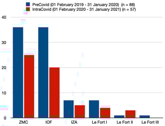 The present study retrospectively examined patients who presented to the Emergency Department of the Army Hospital Hamburg with ZMC, IOF, IZA, or Le Fort fractures between February 2019 and January 2021. Patients were divided by their date of admission into two cohorts (pre-COVID (PC) February 2019–January 2020 vs. intra-COVID (IC) February 2020–January 2021). All patients were at least 18 years of age and fully capable of providing consent to the procedure/diagnostics and suffered from at least one fracture of the above. Exclusion criteria were incomplete documentation, concomitant mandible fracture, and/or nasal bone fracture. A total of 145 patients were included in this retrospective study.