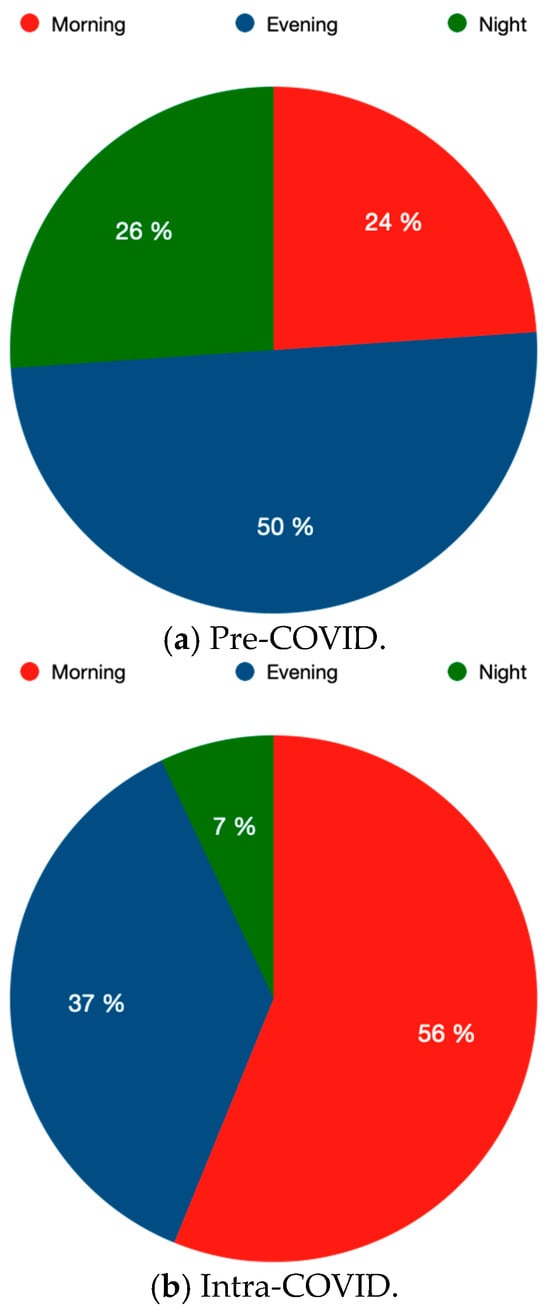 Changes in the time of trauma occurrence considering pre-COVID vs. intra-COVID: morning = 8 a.m.–4 p.m.; evening = 4 p.m.–12 p.m., night = 12 a.m.–8 a.m.