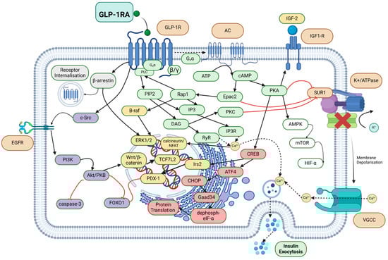 Activation of the GLP-1R results in multiple signalling pathways that increase intracellular calcium, culminating in pancreatic insulin secretion (Figure 1). By imitating the endogenous action of GLP-1, GLP-1 RAs agonise the GLP-1R, a G protein-coupled receptor (GPCR). Once GLP-1 RAs bind, GTP-bound Gαs subunits from the GPCR complexes activate adenylyl cyclase, which converts ATP into cyclic adenosine monophosphate (cAMP). This activates protein kinase A (PKA), which phosphorylates the sulfonylurea receptor-1 (SUR1) subunit of the K+/ATPase channel, leading to early closure of this channel and an amplified physiological Ca2+ influx via voltage-gated calcium channels. Increased insulin secretion can also occur via Gq/phospholipase C (PLC) signalling, where inositol trisphosphate 3 (IP3) binds to its receptor (IP3R) and diacylglycerol (DAG) binds to the ryanodine receptor to stimulate calcium-induced calcium release [17]. In a separate pathway, exchange protein directly activated by cAMP (Epac2) activates ras-proximate-1 (Rap1) [20], which activates PLC and increases downstream IP3/DAG levels, likewise inducing calcium release. Epac2 further enhances insulin exocytosis, as Epac2/Rim2/Piccolo complex binding to the Rab3–insulin interface enables exocytosis of insulin granules [17]. The calcium-permeable transient receptor potential melastatin 2 (TRPM2) channel has also been implicated in GLP-1-related insulin secretion via cAMP and PKA signalling [21]. Desensitisation of the GLP-1R is prevented through regular internalisation for intracellular trafficking and recycling, mediated by Gaq and β-arrestin pathways [22].