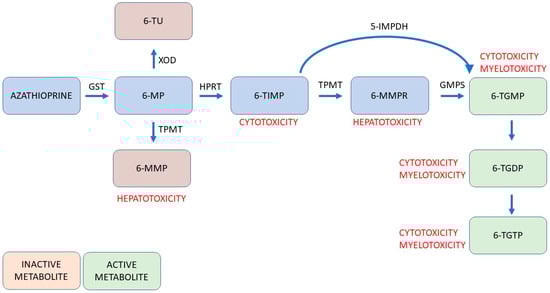 Schematic view of simplified metabolism of thiopurines considering the properties of individual metabolites and their potential toxic influence. Abbreviations: 5-IMPDH, 5-inosine monophosphate dehydrogenase; 6-MMP, 6-methylmeracptopurine; 6-MMPR, 6-methylmeracptopurine ribonucleotide; 6-MP, 6-mercaptopurine; 6-TIMP, 6-thioinosine monophosphate; 6-TGDP, 6-thioguanosine diphosphate; 6-TGMP, 6-thioguanosine monophosphate; 6-TGTP, 6-thioguanosine triphosphate; 6-TU, 6-thiouric acid; GMPS, guanosine monophosphate synthetase; GST, glutathione S-transferase; HPRT, hypoxanthine-guanine phosphoribosyltransferase; TPMT, thiopurine methyltransferase; XOD, xanthine oxidase [13].