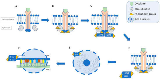Schematic view of the JAK-STAT signalling pathway. (A) Recruitment of JAK molecules by activated cytokine receptor. (B) Phosphorylation of JAK molecules and receptor domains. (C) Recruitment of STATs and their phosphorylation. (D) Dissociation from the receptor and dimerization of STATs. (E) Migration of STAT dimers into the nucleus. (F) Transcription of pro-inflammatory genes. Abbreviations: DNA—deoxyribonucleic acid; RNA—ribonucleic acid; STAT—signal transcuder and activator of transcription [36].