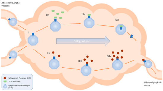 Schematic view of the simplified mechanism of action of S1PR modulators in the lymph nodes. (I) Migration of the lymphocytes with the lymph to the lymph nodes via afferent lymphatic vessels. (IIa) Binding of the S1PR modulator to the S1PR on the surface of the lymphocyte. (IIIa) Internalisation of the S1PR bound to the modulator. (IVa) Disruption of the migration of the lymphocytes towards the efferent lymphatic vessel. (IIb, IIIb, IVb) Migration of the lymphocytes in the lymph nodes towards the efferent lymphatic vessel following the S1P gradient [77].