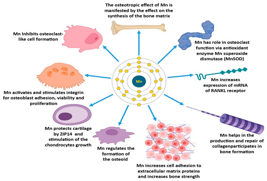 The role of manganese (Mn) in bone cellular and molecular functions. The trace element Mn, with its various biochemical and physiological effects, participates in the synthesis of bone matrix, the inhibition of the formation of osteoclast-like cells, antioxidant function with the enzyme Mn superoxide dismutase (MnSOD), and mRNA expression of RANKL receptors; it also contributes to cell adhesion with extracellular matrix proteins, regulating osteoid formation. It also protects cartilage and stimulates chondrocyte growth through ZIP14. This is important for its integrin-activating functions, which contribute to the adhesion, integrity, and proliferation of osteoblasts.