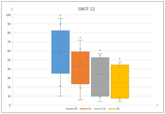 SNOT-22 values at different time intervals (on the x axis timing of subjective reporting are reported; on y axis the actual values of SNOT-22 are reported). Legend. SNOT-22: 22-item Sino-Nasal Outcome Test; T0: baseline; T1: at 1 month after IRT; T3: at 3 months after IRT; T6: at 6 months after IRT. *—statistically significat (p < 0.05).