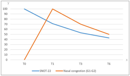 The decrease in terms of SNOT-22 mean value was statistically significant from T0 and T6 with a p-value < 0.001. However, when analyzing the single time intervals, we found that the trend to decrease turned out to be statistically significant in all cases: T0–T1 had a p-value of <0.015, T1–T3 had a p-value of <0.002, and T3–T6 had a p-value of <0.005.