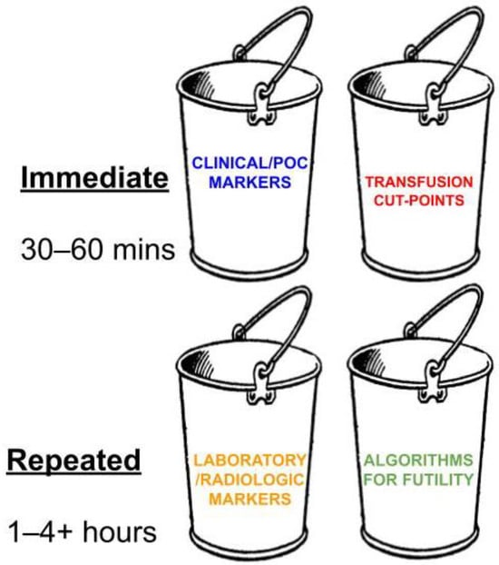 The resuscitation of a patient in hemorrhagic shock who requires massive transfusion (MT) and is not responding can be compared to pouring water into a leaky bucket. This analogy derives from the Latin word for futile which is “futilis” []. Defining futility is a very difficult endeavor, which is dependent not only on the number of blood products administered per hour but also on the “complex integration of patient- and time-specific data”. In the setting of the hectic moments of resuscitation where the measurement of the likelihood of death is dependent on many variables, it is often very difficult to find consensus among practicing clinicians []. As a result, there is a need to provide practical recommendations which will allow for the declaration of futility in this group of patients []. Recent definitions of futility in the transfer of trauma patients include a conservative definition for futile transfers as patients who died, had comfort measures implemented, or were discharged to hospice within 48 h of transfer based on previous studies of different surgical populations [,]. For the purposes of this review, we refer to futility as death within 24 h of admission because most deaths of SBTPs occur in the first 24 h [].