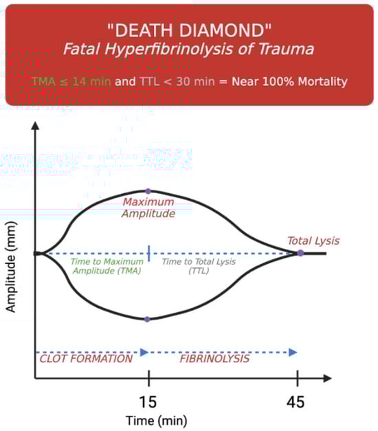 - Chapman, M.P.; Moore, E.E.; Moore, H.B.; Gonzalez, E.; Morton, A.P.; Chandler, J.; Fleming, C.D.; Ghasabyan, A.; Silliman, C.C.; Banerjee, A.; et al. The “Death Diamond”: Rapid Thrombelastography Identifies Lethal Hyperfibrinolysis. J. Trauma Acute Care Surg. 2015, 79, 925–929. [Google Scholar] [CrossRef] [PubMed]