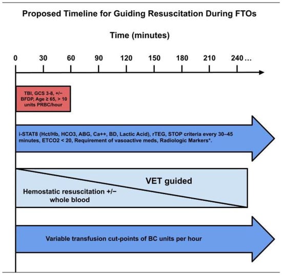 The delayed markers and tests are not immediately available at the bedside, such as common coagulation tests (CCTs), partial thromboplastin time (PTT), prothrombin time (PT), international normalized ratio (INR), hematocrit/hemoglobin, platelet count, fibrinogen level, ionized calcium, and laboratory non-bedside pH and lactate tests [,,,,,]. A combination of these immediate and delayed parameters could be applied sequentially during “futility time-outs” (FTOs), “transfusion time outs” (TTOs), or “resuscitation time-outs” (RTOs) as a foundation for determining futility of continuing MT. These “time-outs” will enable traumatologists to reassess the likelihood of survival based on cut-points of blood products given in conjunction with other markers that may predict the likelihood of a favorable physiologic response to resuscitation [,,,,,,].