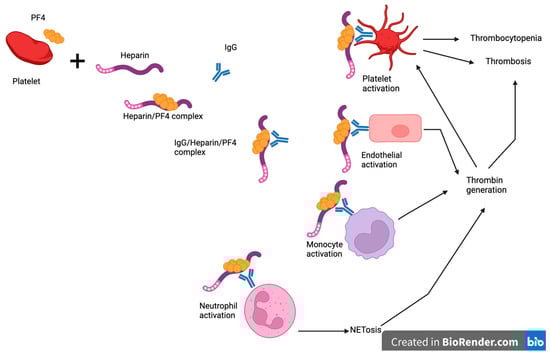 PF4 is stored in alpha granules and released upon activation of platelets. Upon binding to heparin or other polyanions, PF4 undergoes a conformational change to allow binding with HIT antibodies [16]. These immune complexes bind to platelet FcγRIIA receptors with downstream platelet activation, leading to thrombosis and consumptive thrombocytopenia [15]. More recently, the interaction of the immune complexes with neutrophil FcγRIIA receptors and subsequent NETosis has also been shown to be a major contributing factor in HIT-associated thrombosis by supporting thrombin generation. In addition, HIT antibodies also bind to PF4/glycosaminoglycan complexes on endothelial cells and monocytes with consequent expression of tissue factor and thrombin generation [17]. Thrombin promotes thrombosis and further activation.