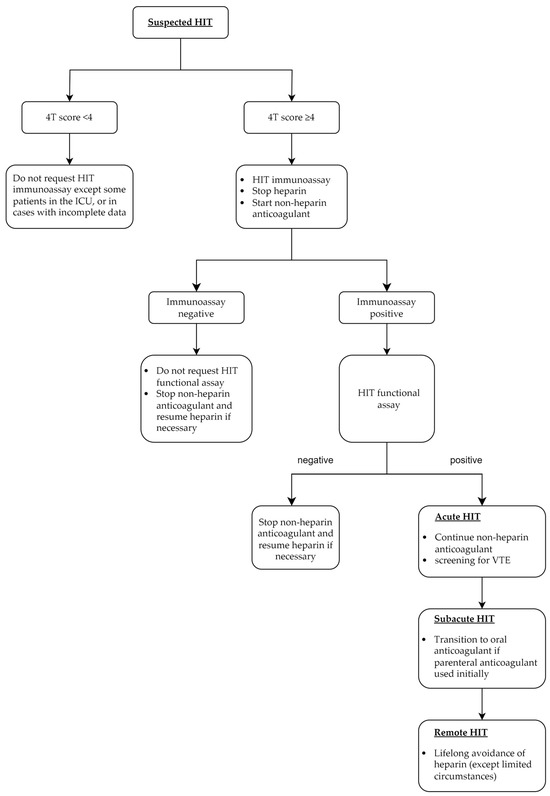 - Arachchillage, D.J.; Thachil, J.; Anderson, J.A.M.; Baker, P.; Poles, A.; Kitchen, S.; Laffan, M.; Committee, T.B. Diagnosis and management of heparin-induced thrombocytopenia: Third edition. Br. J. Haematol. 2024, 204, 459–475. [Google Scholar] [CrossRef]