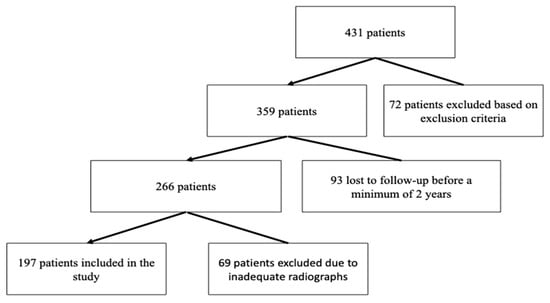 In this retrospective observational study, 204 knees of 179 patients out of 431 patients who underwent TKA for varus knee OA between January 2019 and July 2021 were included (Figure 1). Of the patients, 27 were men, and 152 were women. Of the 179 patients included in the study, 154 patients underwent TKA on one knee, and 25 patients underwent TKA on both knees. All patients underwent surgery using the same surgical technique, and the prosthetic design used for all patients was a posterior-stabilized fixed bearing. Routine preoperative and follow-up full leg standing anteroposterior and lateral knee radiographs were performed for each patient who underwent TKA.