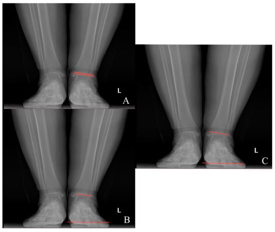 (A) Talar tilt angle; (B) ground talar dome angle; (C) ground tibia plafond angle.