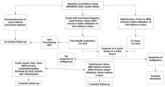 CAPS recommends annual screening in patients with normal pancreatic tissue or without concerning lesions and neuroendocrine tumors <10 mm, which aligns with the guidelines by the ASGE [77]. CAPS recommends a six-month follow-up in patients with cystic lesion of size ≥ 3 cm, a main pancreatic duct of 5–9 mm, lymphadenopathy, increased serum CA-19-9, and a growth rate of ≥5 mm/2 years [77]. A closer follow-up in 3 months is recommended for patients with solid lesions <5 mm, main pancreatic duct dilatation of 5–9 mm, and main pancreatic stricture and/or dilatation of ≥5 mm without a mass [77]. The AGA also has similar recommendations with a 6–12-month follow-up for low-risk lesions, 3–6 months for indeterminate lesions, and within 3 months for high-risk lesions [9,16]. A diagnostic approach for pancreatic cancer surveillance in patients from high-risk groups depending on the findings of initial testing is outlined in Figure 1.