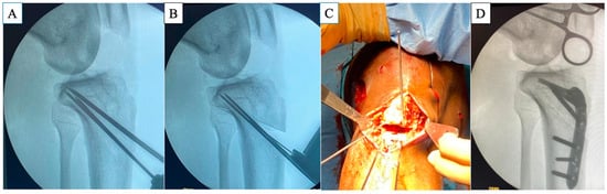 Surgeries were performed under general or spinal anesthesia with a pneumatic tourniquet. First, if an autograft was chosen, the graft was harvested and prepared for ACLR. Arthroscopic examination and intra-articular pathology procedures, such as meniscal and chondral lesions, were performed as needed. The femoral bone tunnel was drilled via the inside–out technique with diameters corresponding to the graft size. The infratubercle ACWO procedure was then performed. An anterior approach to the proximal tibia with a longitudinal skin incision and exposure for ACWO was performed. The superficial medial collateral ligament was minimally released for medial exposure, and the tibialis anterior muscle was released for lateral exposure. Two K-wires were inserted from just distal to the tibial tubercle toward the posterior cortex under fluoroscopic control. Additional K-wires were inserted distally according to preoperatively measured distances. The osteotomy was performed using an oscillating saw (Precision®, Stryker, Bruz, France), avoiding breaking the posterior hinge. The anterior bone wedge was removed, and the osteotomy site was closed by compressing the proximal tibia. The intended PTS was achieved under fluoroscopic control, and the Activmotion® HTO plate (Newclip Technics, Haute Goulaine, France) was used to maintain the osteotomy site (Figure 2). After the osteotomy, the tibial bone tunnel for ACLR was created. Finally, ACLR using either autograft or bone–patellar tendon–bone allograft was performed with lateral extra-articular tenodesis using modified Lemaire techniques [35]. The graft choice was based on the number of ACLR and the previous graft source.