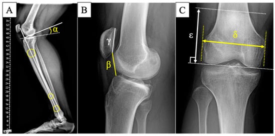 Measurement of radiographic parameters using plain radiograph. (A) posterior tibial slope = α. (B) Caton–Deschamps index = β/γ. (C) femoral patellar height index = δ/ε.