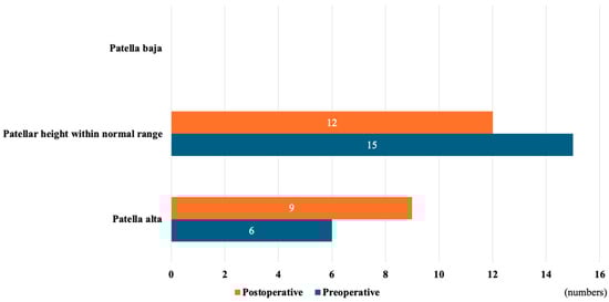 Patellar height was classified as patella baja, normal, or alta according to CDI values both pre- and postoperatively. A CDI of 0.8 to 1.2 indicates normal patellar height, while a CDI > 1.2 indicates patella alta, and a CDI < 0.8 indicates patella baja [42,43]. Although FPHI has been validated with good to excellent intra- and inter-rater reliability [28,41,44], there are no globally accepted criteria for FPHI, so it was not used to categorize patellar height. Knee recurvatum was measured with a goniometer preoperatively and at a final follow-up.