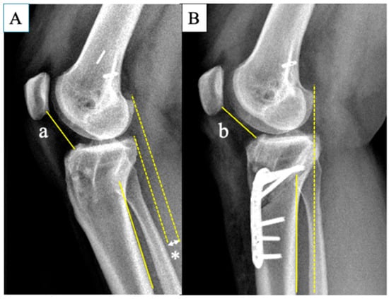A representative case of a patient who underwent combined infratubercle ACWO with revision ACL reconstruction. (A) Preoperative plain lateral knee radiograph showing anterior tibial translation relative to the femur (*) due to ACL deficiency and an excessively high PTS. (B) Anterior tibial translation is reduced after surgery. Consequently, distance “a” increases slightly to distance “b” due to the reduction in anterior tibial translation after surgery. ACWO, anterior closing wedge osteotomy; ACL, anterior cruciate ligament; PTS, posterior tibial slope.