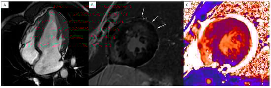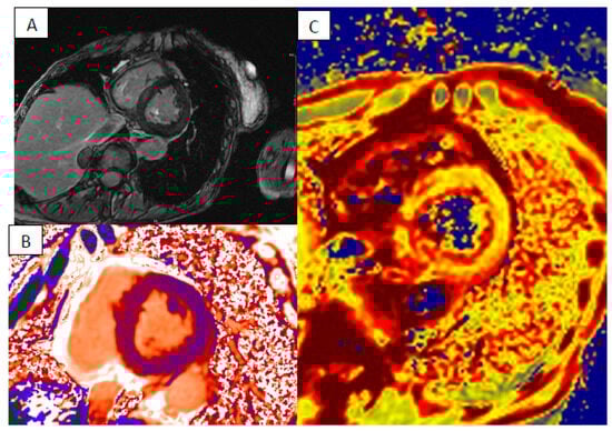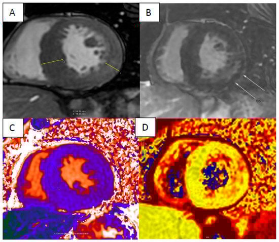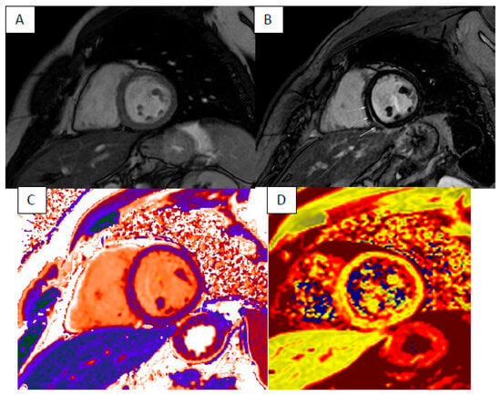 In hypertrophic cardiomyopathy (HCM), sarcomere dysregulation leads to pro-inflammatory pathway activation, determining a chronic inflammatory state that worsen disease severity and patient prognosis. CMR can play a significative role in individuating myocardial inflammation and fibrosis (Figure 4) [,]. Moreover, T1 and T2 relaxation times’ increase may anticipate hypertrophy onset, as demonstrated by Huang L et al. [,].