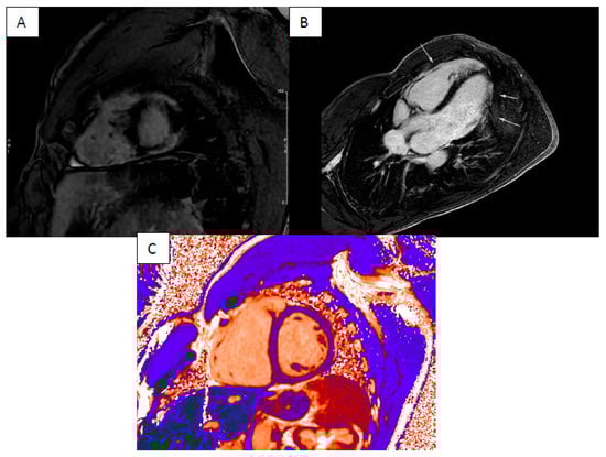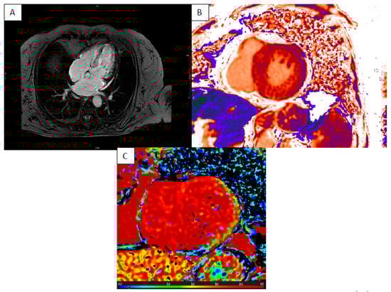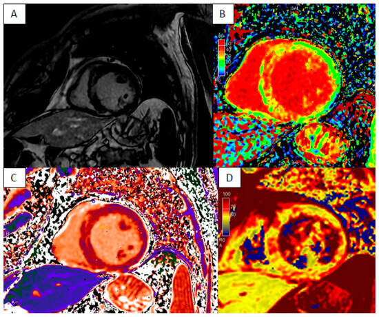 Cardiac magnetic resonance (CMR) has acquired a pivotal role in modern cardiology. It represents the gold standard for biventricular volume and systolic function assessment []. CMR allows for non-invasive myocardial tissue evaluation, highlighting tissue edema, fibrosis, fibro-fatty infiltration and iron overload. Moreover, even if its clinical use is limited by specific contraindications, CMR imaging does not suffer from acoustic window variability, which represents a potential limitation to echocardiography.