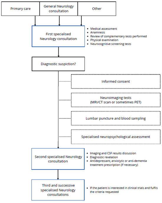 The participant recruitment process is summarized in Figure 1. The first visit of the patients was with one of the neurologists of the research group in AD, who carried out a medical assessment, anamnesis, physical examination, and commonly performed some neurocognitive screening tests. The patients were mostly referred from primary care but also from general neurology consultation and consultations of other specialities or other ways. If an aetiologic disease diagnosis is suspected, patients will be rescheduled for neuroimaging tests if they are not available (MRI/CT scan or sometimes PET), general blood sampling, amyloid status determination by CSF analysis or amyloid brain PET, and finally specialised predefined neuropsychological assessment, realized in one session of interviews spanning no more than 2.5–3 h. When these other tests are available, a second specialised consultation is held with the neurologists, who re-evaluate the patient and complement data in order to establish the diagnosis, when possible. Rarely, other supplementary tests could be requested. Also, some treatments could be prescribed according to the diagnosis. If the patient is interested in clinical trials and fulfils the requested criteria, participation can be offered to them in a subsequent consultation. Clinical trials are carried out by a concrete group of members of the research team, including neurologists, neuropsychologists, nurse coordinators, and data managers. This team is responsible for reviewing trial protocols to organise future follow-up visits and, when required, drug administration.