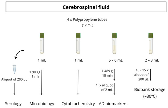 Almost all participants underwent a lumbar puncture to obtain CSF biomarkers, generally with a 20G traumatic lumbar puncture needle. The CSF was collected between 9 and 11 a.m. in three polystyrene tubes and one polypropylene tube. The polypropylene tube is used for the detection of AD biomarkers (Aβ42, Aβ40, total tau, p-tau181, NfL, Aβ42/Aβ40, Aβ42/t-tau). The other two polystyrene tubes are used for standard cytobiochemistry analytics (macroscopic examination, erythrocytes, leukocytes, glucose, proteins) and microbiological investigations (a bacteriologic culture and treponema pallidum total antibodies). The last polystyrene tube is collected for biobank storage. The full protocol for CSF processing is detailed in Figure 2.