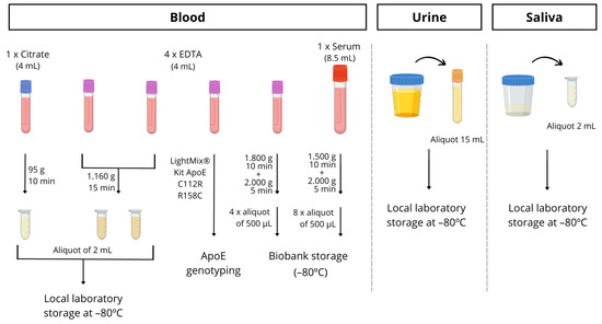 Blood is drawn from all participants utilizing routine clinical practice. Specifically, 6 tubes of blood are collected, with 1 8.5 mL tube without anticoagulant for biobank storage, a 4 mL citrate tube for the detection of microRNAs in platelets, and 4 tubes of 4 mL with EDTA. Among the latter tubes, a whole blood sample was used for Apolipoprotein E genotyping, and it was determined following the manufacturer protocol by PCR using LightMix® Kit ApoE C112R R158C from Roche Diagnostics (https://www.roche-as.es/lightmix_global, accessed on 23 June 2023). A specific ApoE genotype informed consent was always obtained. Another whole blood EDTA tube for biobank storage and two tubes for processing in the laboratory and plasma separation were utilized. So, these aliquots were centrifuged within 1–2 h of collection and stored at −80 °C until required for analysis. The full protocol for processing the blood is described in detail in Figure 3.