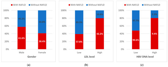 Distribution of NAFLD cases by (a) gender, (b) LDL level, and (c) HBV DNA level. HBV: hepatitis B virus; LDL: low-density lipoprotein; NAFLD: non-alcoholic fatty liver disease.