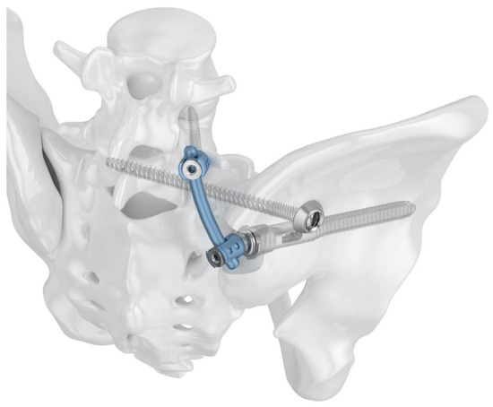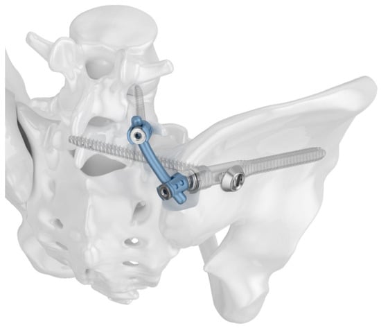 Many studies have been conducted with the objective of optimizing iliosacral stabilization. One approach to enhancing the stability of the golden standard—the iliosacral screw—is to perform a cement augmentation procedure in osteoporotic bone. This procedure has been reported to significantly increase stability in several biomechanical studies [34,35,36]. The number of screws placed is also a significant factor in achieving stability. Two iliosacral screws have been shown to provide superior biomechanical results compared to a single screw [37,38]. Nevertheless, the variations in the S1 and/or S2 anatomical corridors frequently preclude the secure screw placement [39,40]. Another crucial factor is the length of the iliosacral implants. Longer screws have been demonstrated to achieve higher biomechanical stability [41,42,43]. The transiliac-transsacral approach—in which screws are placed from one ilium through the sacrum using the S1 or S2 corridor into the contralateral ilium—has been found to provide the highest biomechanical stability [43,44,45]. Considering the aforementioned factors, the iliosacral bar osteosynthesis was introduced and demonstrated favorable clinical outcomes [46,47].