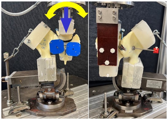Setup with a specimen mounted for biomechanical testing. View from anterior (left) and lateral (right). Blue and yellow arrows indicate axial and torsional load applications, respectively.