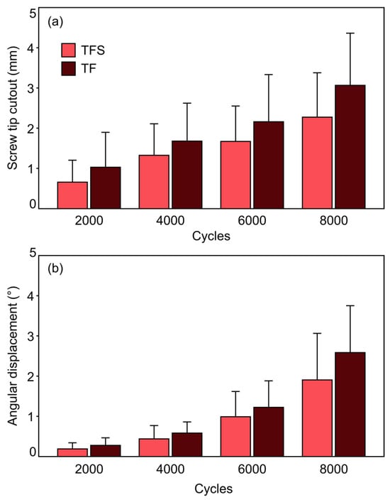 Figure 6 presents the values for the parameters of the sacral screw cutout and screw loosening in the iliac bone evaluated over the first 8000 cycles at four intermittent time points. In both groups, both the sacral screw cutout and screw loosening in the iliac bone demonstrated a significant increase over the number of cycles (p ≤ 0.005). The TFS group showed a 3.5-fold increase in mean sacral screw cutout and the TF group showed a 3.0-fold increase between cycles 2000 and 8000. In regard to the mean screw loosening in iliac bone, the TFS group demonstrated a 10.1-fold increase and the TF group demonstrated a 9.3-fold increase between cycles 2000 and 8000. There were no significant differences between the two groups for either of these parameters (screw cutout p = 0.334; screw loosening in the iliac bone p = 0.344), although the TFS group had lower values for both the sacral screw cutout and screw loosening in the iliac bone. The difference between the TFS and TF groups for mean sacral screw cutout was +56.4% at 2000 cycles, +26.7% at 4000 cycles, +29.3% at 6000 cycles, and +34.8% at 8000 cycles, whereas this difference for mean screw loosening in the iliac bone was +46.9% at 2000 cycles, +33.0% at 4000 cycles, +23.4% at 6000 cycles, and +35.7% at 8000 cycles.