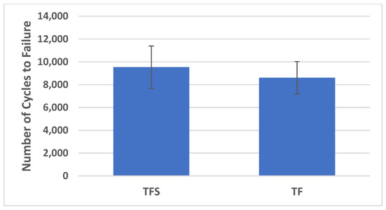 The mean number of cycles to failure was 9534 (SD 2006) for the TFS group and 8605 (SD 1536) for the TF group (Figure 7). This difference was not significantly different (p = 0.350). The TFS group demonstrated 10.8% higher mean cycles to failure compared to the TF group.