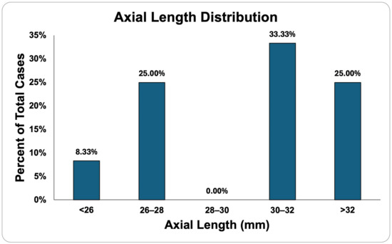All eyes (17/17) had nuclear sclerotic (NS)-type cataracts. Additional posterior subcapsular (PSC) components were observed in 41% of eyes, while anterior subcapsular (ASC) and cortical spoke (CS) components were each found in 6% of eyes. Concerning NS, 94% of cases were grade 2+ or more. The preoperative biometric findings of the patients who underwent pIOL-CE are included in Table 1. The mean axial length was 29.58 mm ± 2.93 (range: 26.07 to 33.7). See Figure 1 for further information on the distribution of axial lengths.