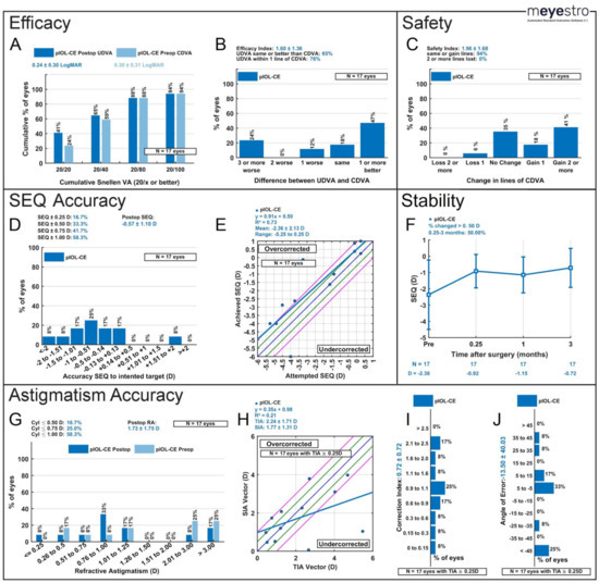 Nine standardized refractive surgery graphs at three months after CE. (A) Postoperative uncorrected distance visual acuity (UDVA) versus preoperative corrected distance visual acuity (CDVA). (B) Efficacy: Change in Snellen lines from preoperative CDVA to postoperative UDVA. (C) Safety: Change in Snellen lines from preoperative CDVA to postoperative CDVA. (D) Spherical Equivalent (SEQ) Accuracy: Accuracy of postoperative spherical equivalent refraction to target. (E) Attempted versus achieved spherical equivalent refraction, with linear regression and correlation values; the black line represents the equation y = x, and the closer the regression line is to the black line, the more accurate the results. (F) SEQ stability; (G) cylindrical astigmatism accuracy; (H) TIA vs. SIA; blue line: target; between green lines: within ±0.50 D of target; between pink lines: within ±1.0 D of target. (I) Histogram of correlation index; (J) angle of error. CE = Cataract extraction; TIA = target-induced astigmatism; SIA = surgically induced astigmatism; ICL = implantable collamer lens; D = diopter.