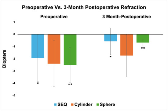 Preoperative vs. 3-month postoperative refractive values. */** = statistical significance p < 0.05 between respective groups. Abbreviations: SEQ, spherical equivalent.