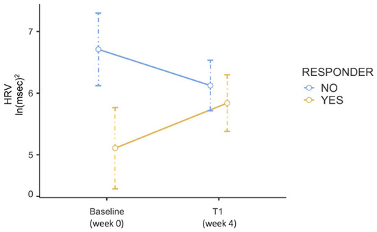 A significant HRV increase from baseline to one month was observed in responders (t = −3.06, p = 0.038), but not in non-responders (t = 2.74, p = 0.067) (Figure 1).