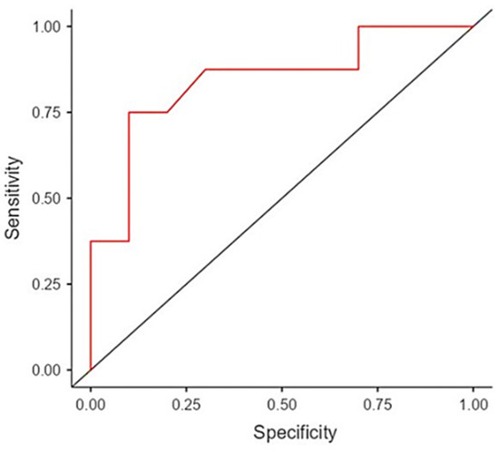 The logistic regression showed that baseline HRV was significantly associated with treatment response (SE = 0.701, OR [95% LLCI-ULCI] = 0.244 (0.06–0.96), p = 0.04). The area under the curve (AUC) was 0.844, and showed a sensitivity of 75%, specificity of 92% and accuracy of 83.3%. These results showed that baseline HRV, as a predictive marker of response, had some discriminative potential in our sample (Figure 2).
