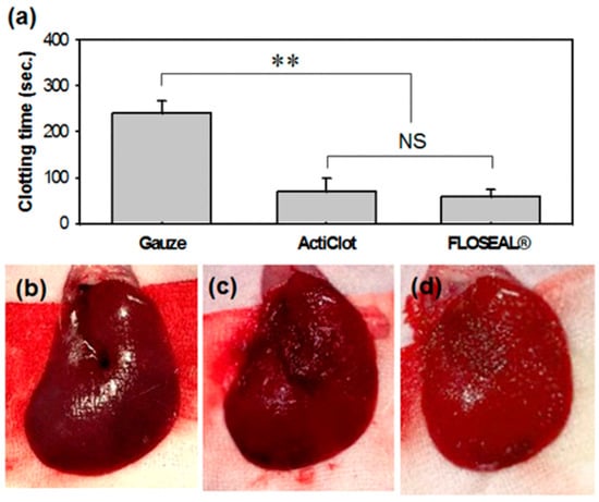 In vivo hemostatic efficacy on rat liver injury model. (a) Hemostasis time measurement of the gauze, ActiClot, and FLOSEAL® groups and additional bleeding check results after hemostatic agent removal; (b) gauze, (c) ActiClot, and (d) FLOSEAL® groups. (n = 8, ** p < 0.05, NS means not significant).