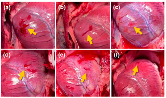 In vivo hemostasis confirmation after 2 min of compression in the porcine heart muscle incision model. The left (a–c) and right (d–f) ventricles of the porcine heart treated with (a,d) cotton gauze, (b,e) ActiClot, and (c,f) FLOSEAL®. The yellow arrow indicates the hemostatic condition after applying hemostatic methods.