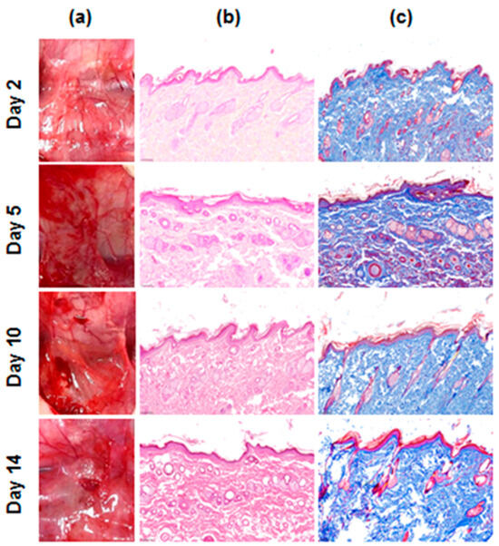 In vivo safety evaluation of the ActiClot matrix in the rat model. (a) Photographs of the site after subcutaneous implantation and (b) the photomicrographs H&E, ((b), pink; cytoplasm, dark blue; nuclei), Masson’s trichrome ((c), dark red; keratin and muscle fibers, pink; cytoplasm, light blue; collagen, dark blue; nuclei) staining of the ActiClot implanted tissue.