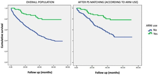 Kaplan–Meier curves for mortality in the overall population and in the PS-matching population comparing those under treatment with ARNIs to those not treated with ARNIs are shown in Figure 1.