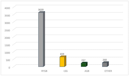 The type of bariatric surgical interventions (Figure 1) was identified for 4803 cases as follows: 3639 cases with RYGBP; 659 cases of LSG; 237 cases of AGB; and other operations in 268 cases.