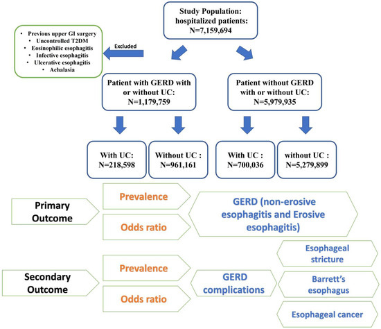In our study, GERD complications (defined as esophageal stricture and BE, with and without dysplastic changes) were only considered in the group of patients diagnosed with GERD. To evaluate the odds ratio of GERD and its related complications in UC patients, we included patients with GERD and GERD complications (cases) against those without the diagnosis of GERD and GERD complications (controls). All diagnoses included or excluded from this study were selected by the ICD-10-CM code.