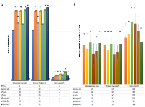 Bar graph of prevalence and odds ratio for patients with UC or subtypes of UC with GERD, NERD, or EE. (A) Prevalence of UC and different subtypes of UC with GERD, NERD, and EE. (B) Adjusted odds ratio of UC or subtypes of UC with GERD, NERD, or EE. Adjusted for age, sex, race, obesity, hiatal hernia, and history of smoking (* p < 0.05); (** p < 0.01). Gastroesophageal reflux disease [GERD]; ulcerative colitis [UC]; non-erosive reflux disease [NERD]; erosive esophagitis [EE].