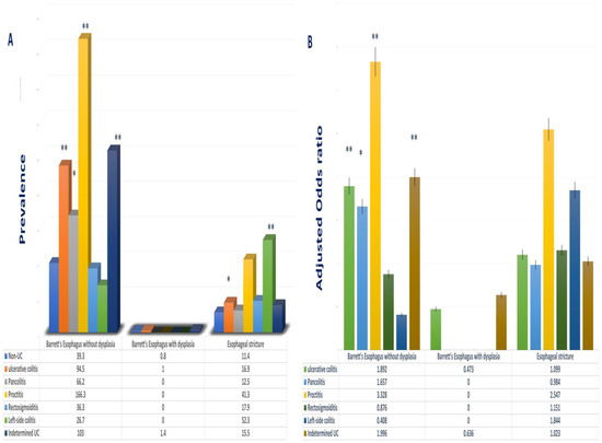 Bar graph of prevalence and odds ratio for patients with UC or subtypes of UC with GERD complications. (A) Prevalence of UC and different subtypes of UC with Barrett’s esophagus and esophageal stricture. (B) Adjusted odds ratio of UC or subtypes of UC with Barrett’s esophagus and esophageal stricture. GERD, gastroesophageal reflux disease; UC, ulcerative colitis. Adjusted for age, sex, race, obesity, hiatal hernia, and history of smoking (* p < 0.05); (** p < 0.01).