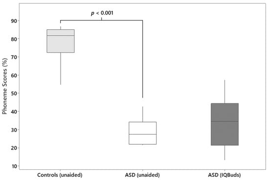 Boxplots showing the percentage of phonemes correctly identified in background noise (0 dB SNR). Findings are for a group of control participants (n = 20) published by Rance et al. (2014) [13] and for children with confirmed autism spectrum disorder (ASD) (n = 13) in 2 conditions: unaided and aided (with IQBuds in situ). The boxes represent the median, 25th and 75th percentiles. Minimum and maximum values are depicted by the end of the whiskers.