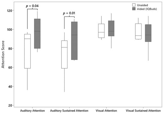 Boxplots showing attention scores obtained by the participants with ASD on each domain of the Integrated Visual and Auditory Continuous Performance Task: auditory attention, auditory sustained attention, visual attention, and visual sustained attention. Results showed a statistically significant improvement in aided (IQBuds in situ) condition compared to unaided for both auditory attention assessments. The boxes represent the median, 25th and 75th percentiles. Minimum and maximum values are depicted by the end of the whiskers.